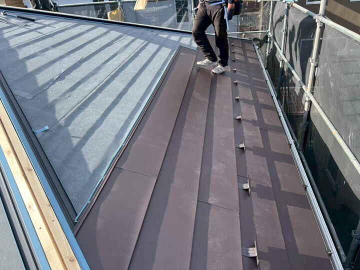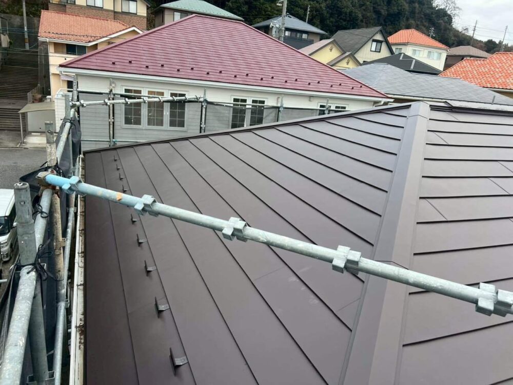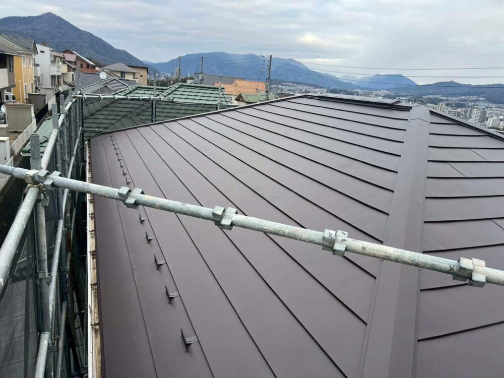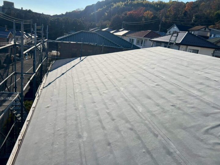 | 施工内容詳細 | 今回の屋根カバー工事では、既存屋根の劣化改善と耐久性向上を目的として、アイジー工業製「スーパーガルテクトフッ素」を使用した施工を行いました。事前の現地調査にて、屋根材の傷み具合や下地の状態、雨漏りの有無を細かく確認し、既存屋根を撤去せずに施工可能なカバー工法が最適であると判断しました。廃材の発生を抑えられる点や工期短縮、建物への負担軽減も大きなメリットとなります。 工事初日は、近隣への配慮として足場の設置と飛散防止用のメッシュシートを施工しました。その後、既存屋根の清掃を行い、棟板金や役物を撤去して下地の状態を確認しました。下地に著しい腐食が見られる箇所については補修を行い、屋根全体の強度を確保しています。続いて、防水性能を高めるため、新しいルーフィング(防水シート)を屋根全面に敷設しました。重ね幅や立ち上がり部分を丁寧に施工することで、雨水の侵入を確実に防ぎます。 ルーフィング施工後、スーパーガルテクトフッ素本体の施工に移りました。屋根材は軽量でありながら高い耐久性を備えており、建物への負担を抑えつつ耐震性の向上にもつながります。一枚一枚を規定通りに固定し、ズレや浮きが生じないよう丁寧に施工しました。また、フッ素塗膜により紫外線や風雨に強く、長期間にわたり美観を保つことが可能です。 棟部やケラバ、軒先などの役物部分についても、専用部材を使用して確実に施工しました。特に雨仕舞には細心の注意を払い、強風時や豪雨時にも安心できる仕上がりとしています。最終工程では全体の仕上がり確認を行い、清掃後に足場を解体して工事完了となりました。今回の屋根カバー工事により、断熱性・遮音性・防水性が向上し、快適で安心な住環境を実現することができました。 #屋根カバー工事 #スーパーガルテクト #スーパーガルテクトフッ素 #ガルバリウム鋼板 #屋根リフォーム #カバー工法 #軽量屋根 #耐久性向上 #フッ素屋根 #施工事例 |